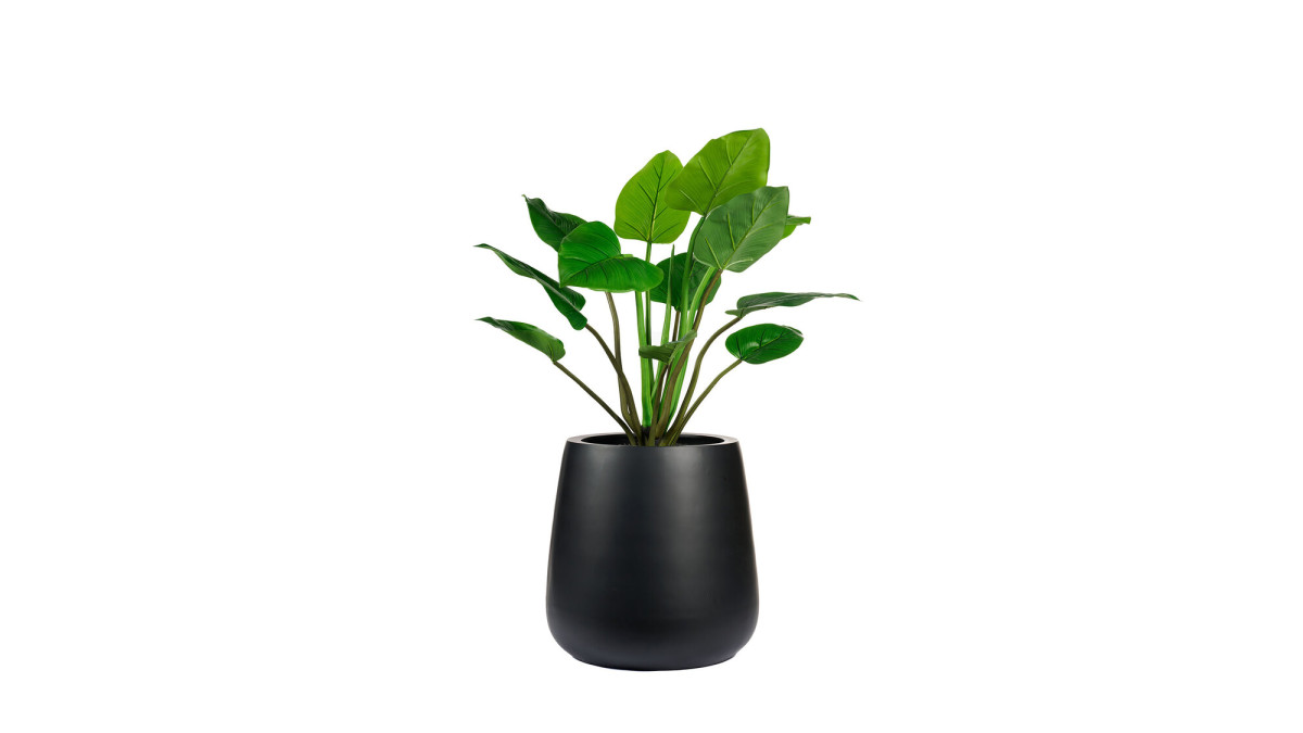 The Nen is a planter, made with an artificial Alocasia and finished with glued anthracite decorative gravel. The Alocasia has a bright, green color and large, oval leaves with natural details. The planter has a size of Ø66 x 67 centimeters and is available in black or white. Hildering Groenkunst is happy to provide the right advice.