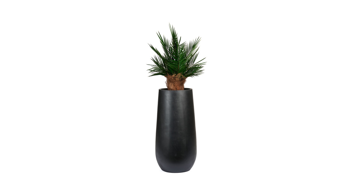 The Duke is a planter, decorated with a Phoenix palm and finished with glued anthracite decorative gravel. Phoenix palms have long, pinnate leaves that grow in a crown at the top of the trunk. The planter is available in light gray or black and in two sizes: Ø 30 x 70 centimeters high and Ø 50 x 101 cm high.